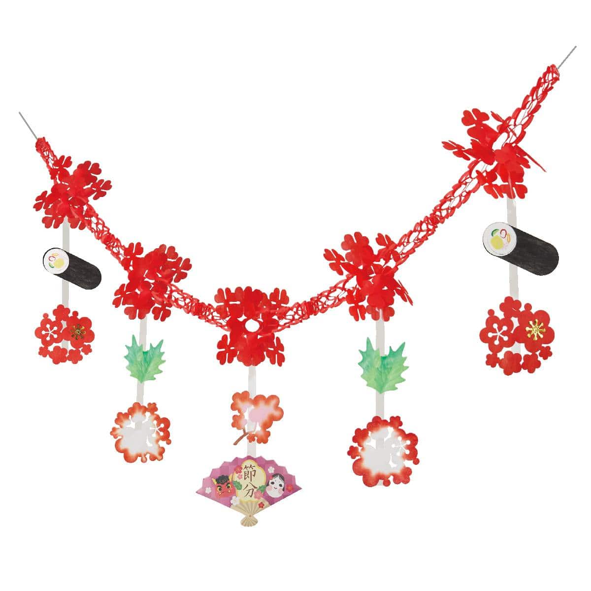 節分イベントを華やかに演出できるガーランドです。恵方巻や梅柄の節分飾りで、恵方巻や豆まきコーナーのディスプレイに。