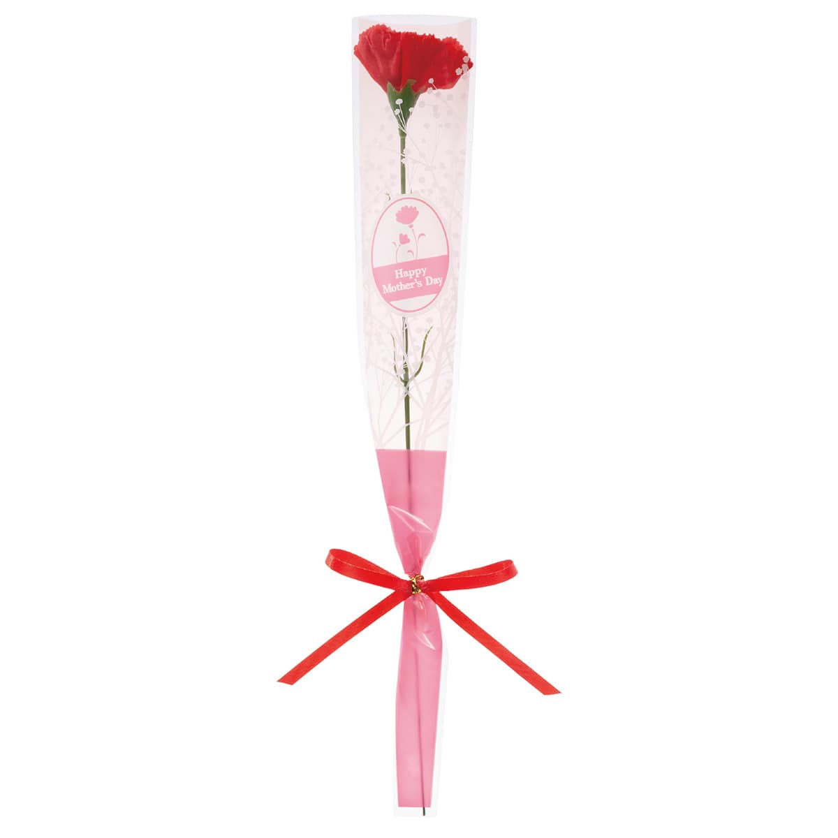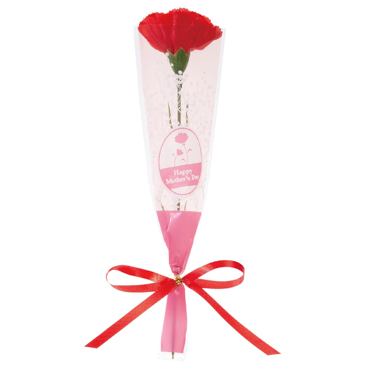 赤いカーネーションの造花が一輪ずつラップに巻かれています。赤いかわいいリボン付きラッピング。