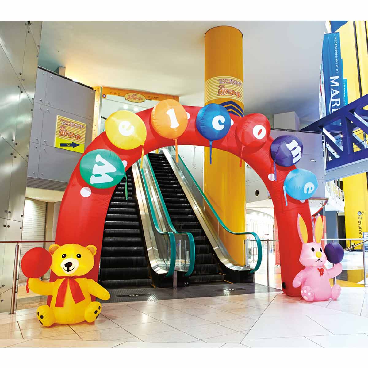 赤い大きなアーチ型のエアブロー。上部にカラフルな「welcome」文字、両脇にかわいいクマとウサギの立体キャラクター付きで注目度アップ間違いなし!