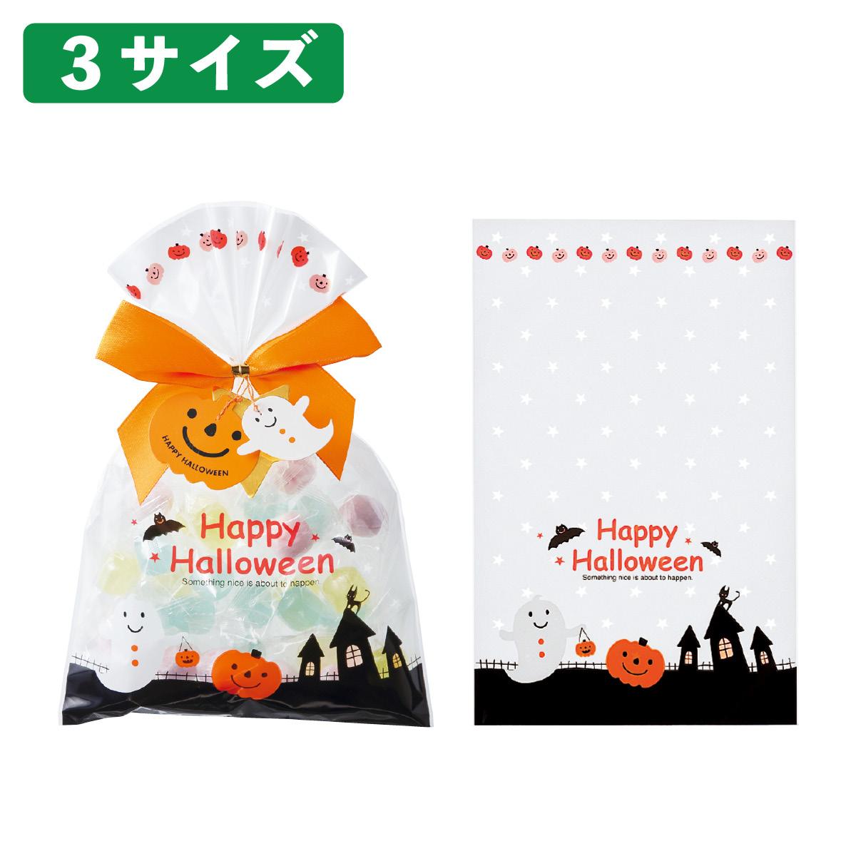 かぼちゃとおばけのイラストがかわいいギフトバッグ。表は透明地にイラスト、背面は白地にうっすら星のデザインが入っていて中のものがきれいに見える作りです。