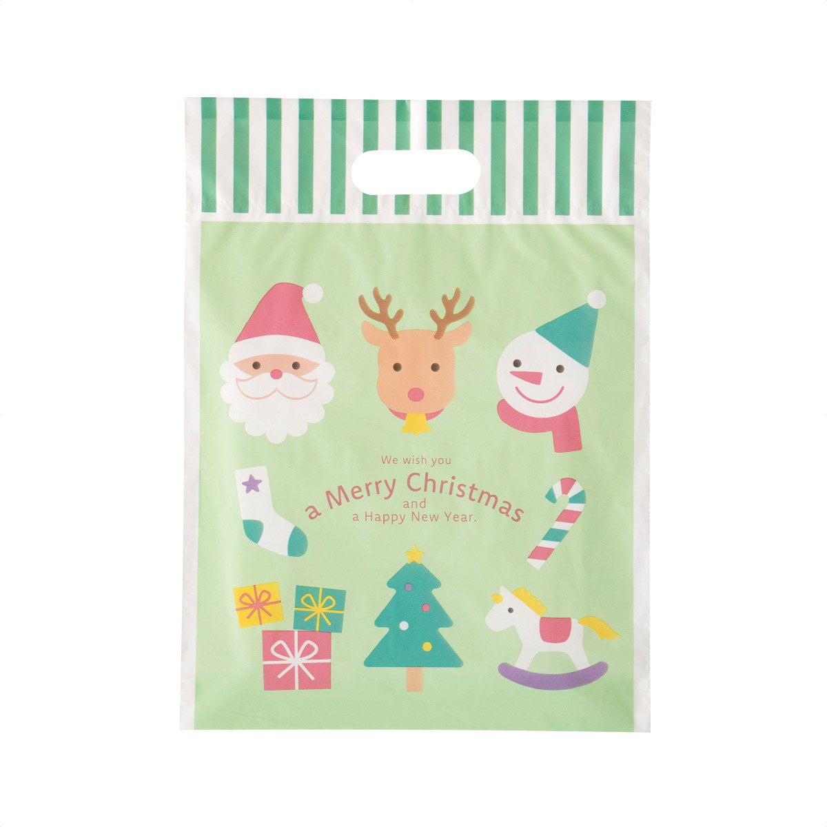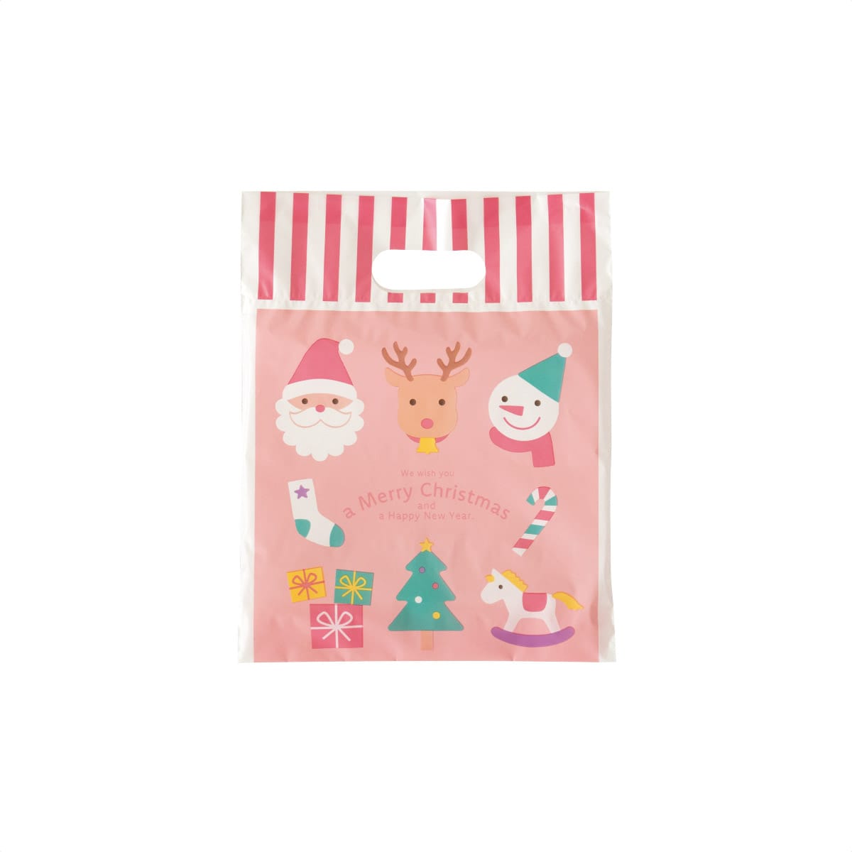 やわらかい色合いで思わずほっこりする【チャーミングクリスマス】シリーズの手提げポリ袋です。サイズによって色が異なります。