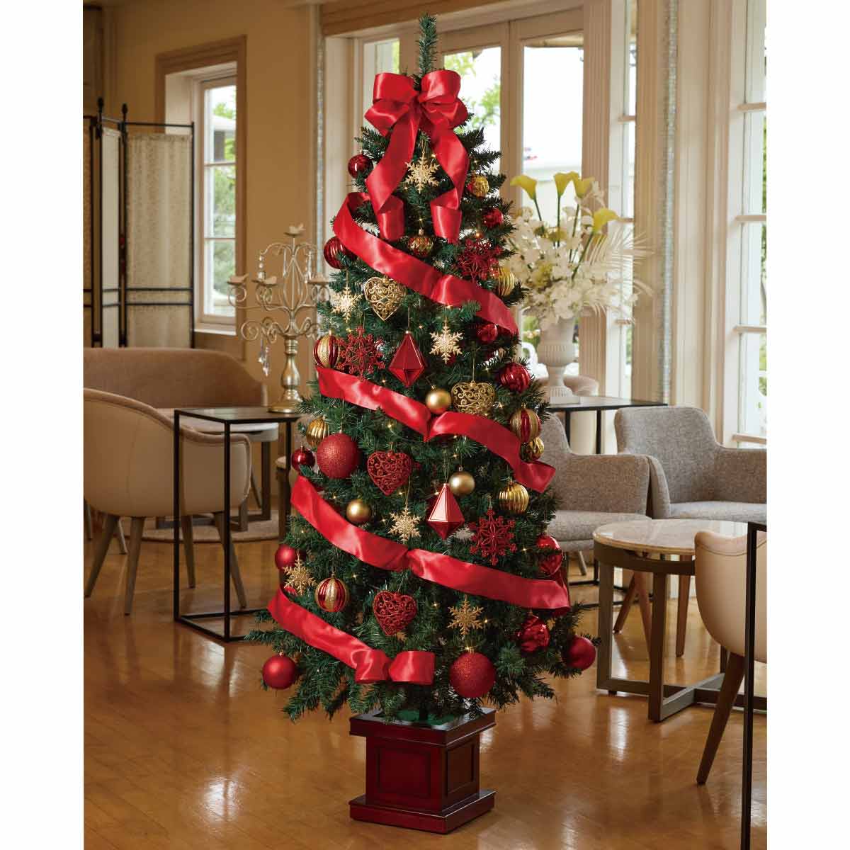 スリムタイプなので、狭いスペースにも背の高いクリスマスツリーを飾ることができます。大ぶりのリボンがアクセントに。王道のレッドがクリスマスらしさを引き立てる華やかなツリーです。