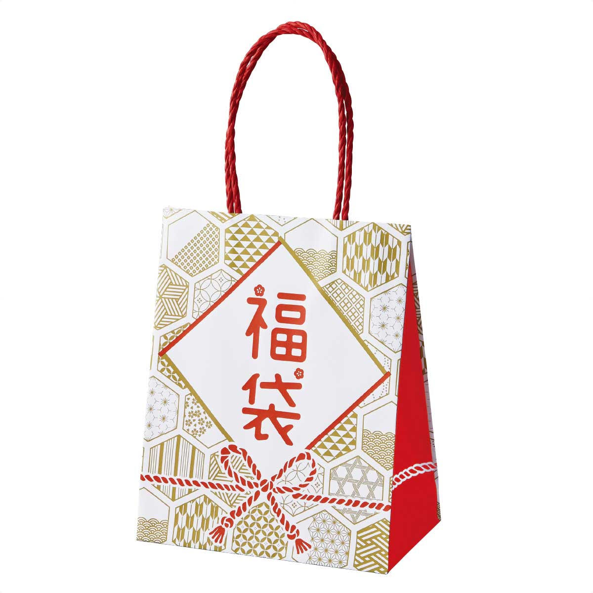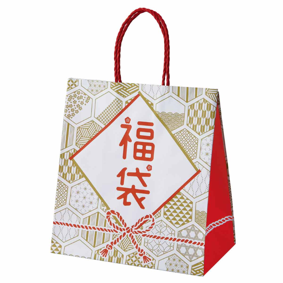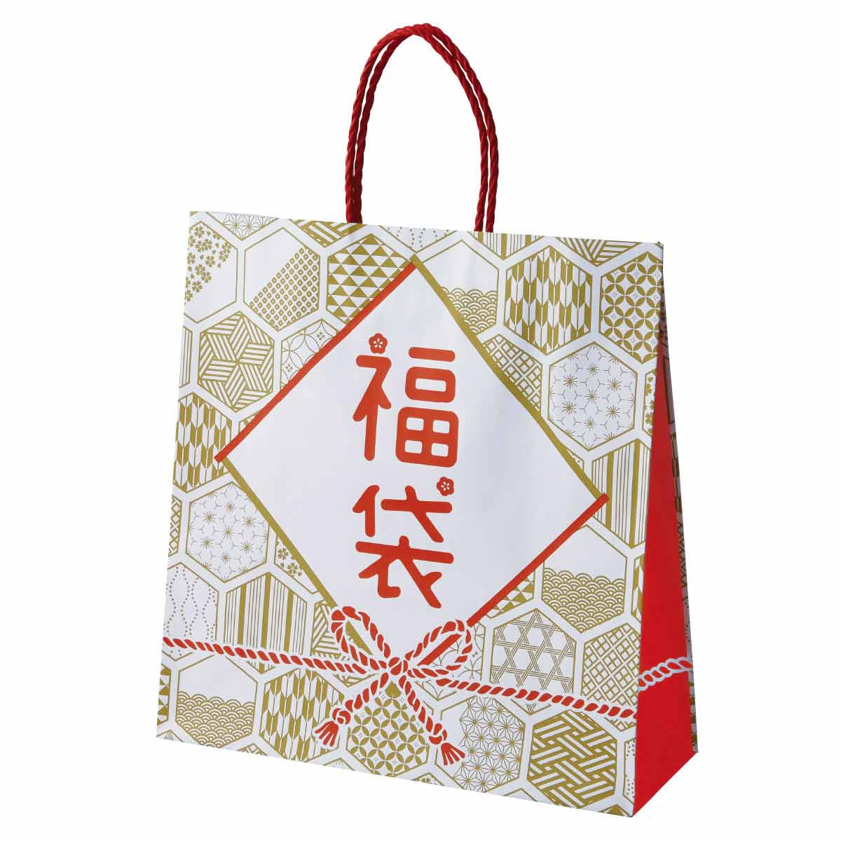 正月の初売りセールに欠かせない福袋用の袋。華やかな紅白のデザインと金色の幾何学模様が、お正月にふさわしい華やかさと上品さを演出します。 ゴールド部分にさりげないラメが入っていて、上品な印象の福袋です。