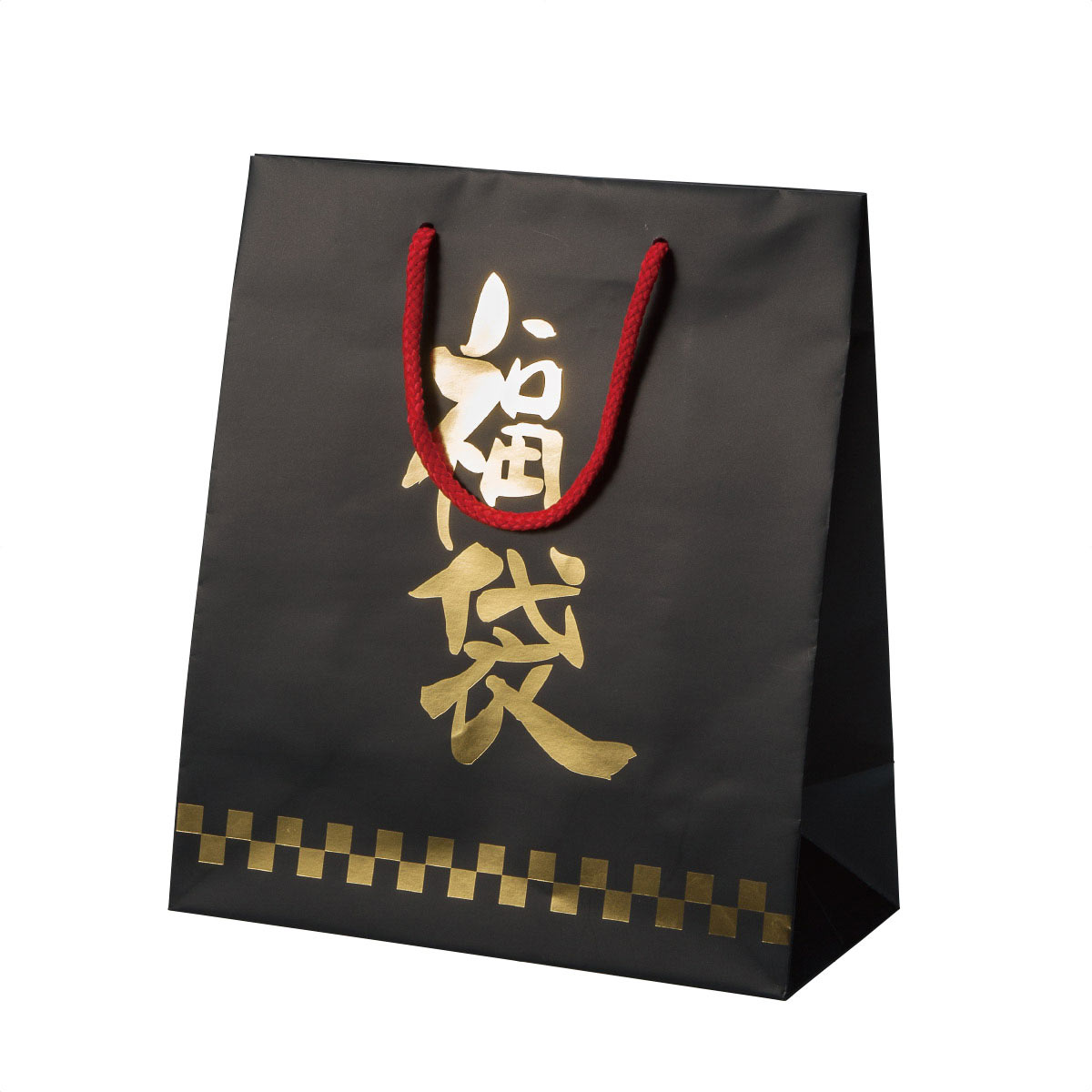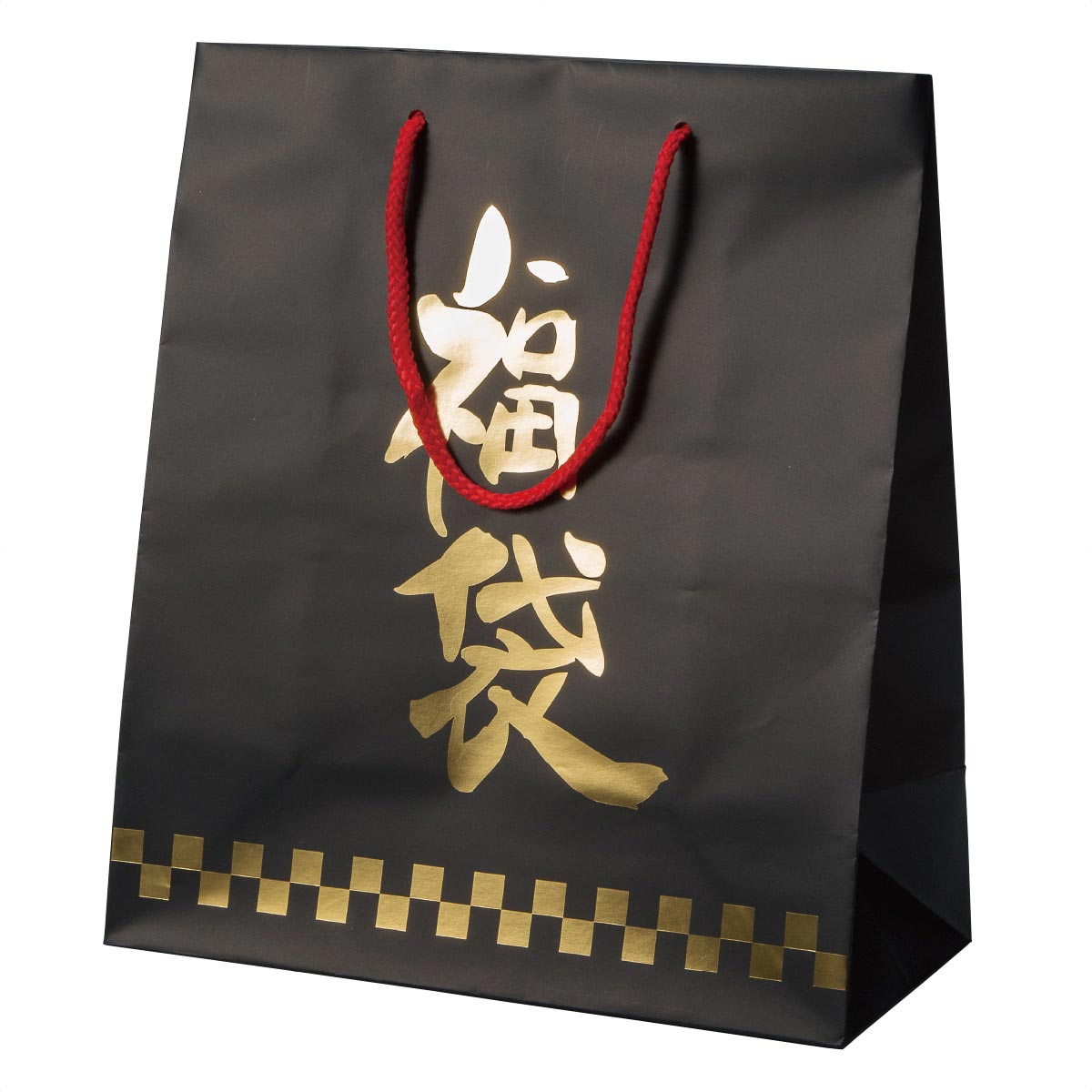 正月の初売りセールに欠かせない福袋用の袋。黒地に金色の「福袋」の文字が映える、高級感あふれるデザインです。