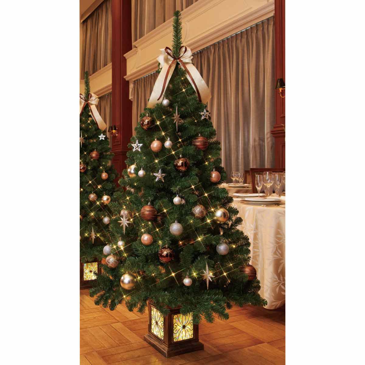 コパーゴールドのオーナメントがおしゃれなクリスマスツリー。足元ポットはあかりが灯り、一層ロマンチックになります。