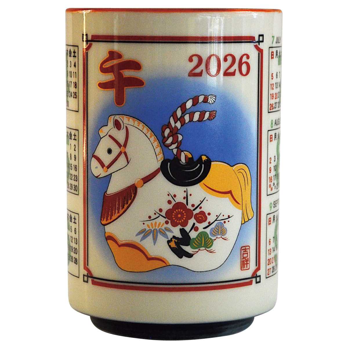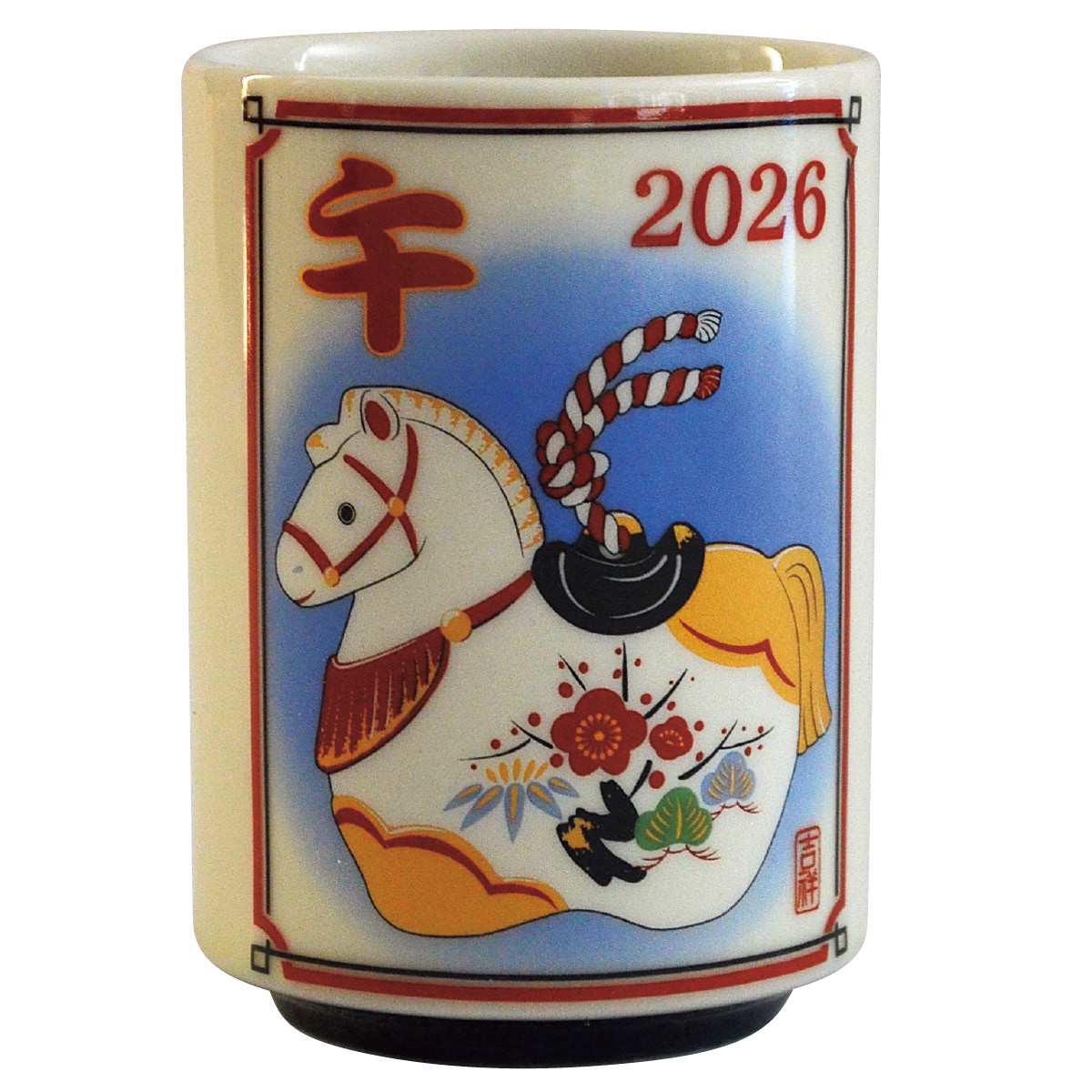 2026年の新年のご挨拶は、縁起の良い干支(午)ノベルティで。販促品や粗品に最適な、開運や商売繁盛を願う縁起のよい湯呑です。