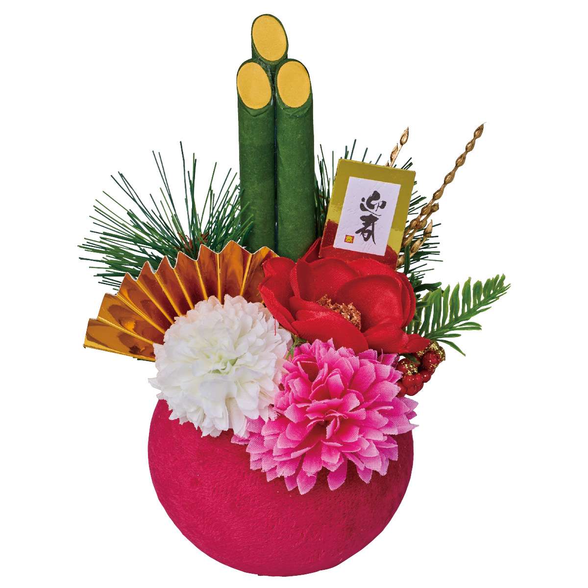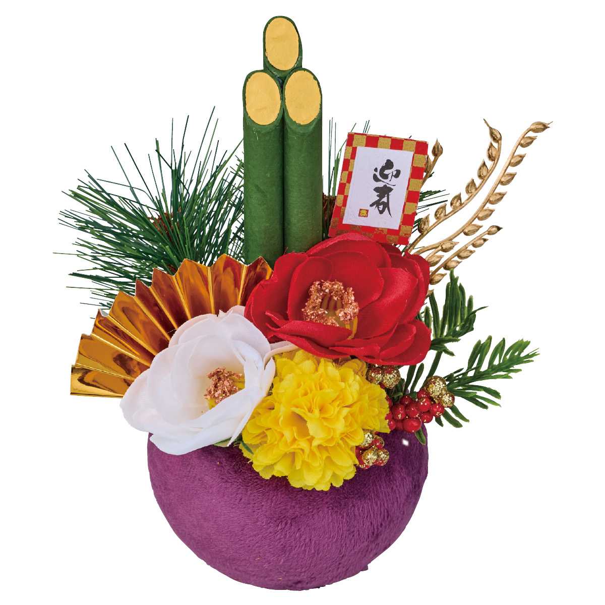 コロンと丸い形がかわいい。鮮やかな色合いのポットが華やかな門松アレンジメントです。