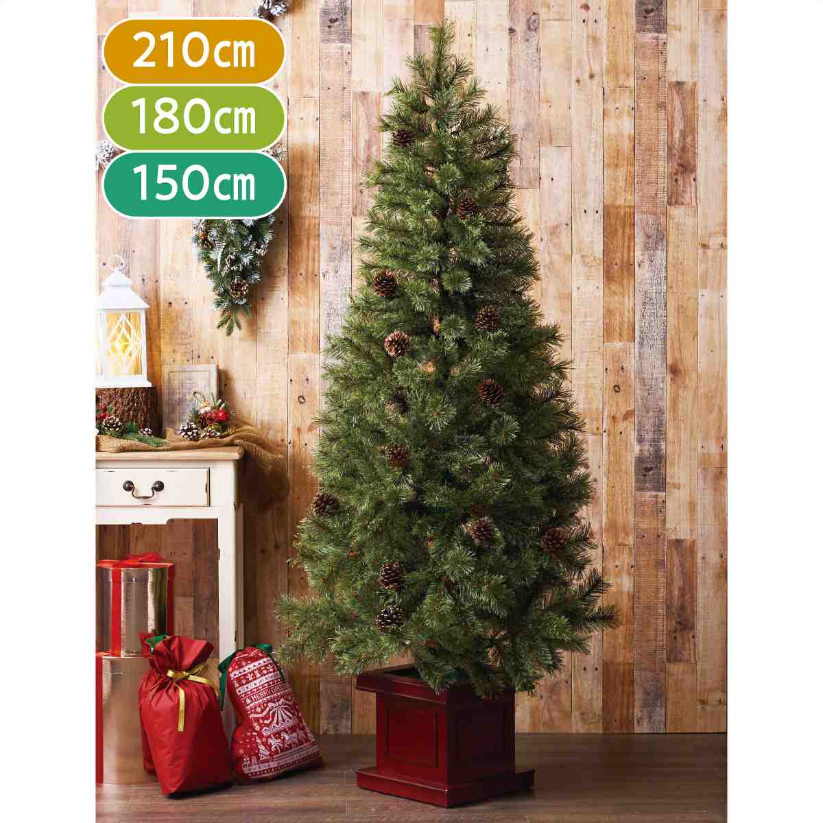 密度のある葉に松ぼっくりが見え隠れ。スリムで飾る場所を選ばないナチュラルなクリスマスツリー。