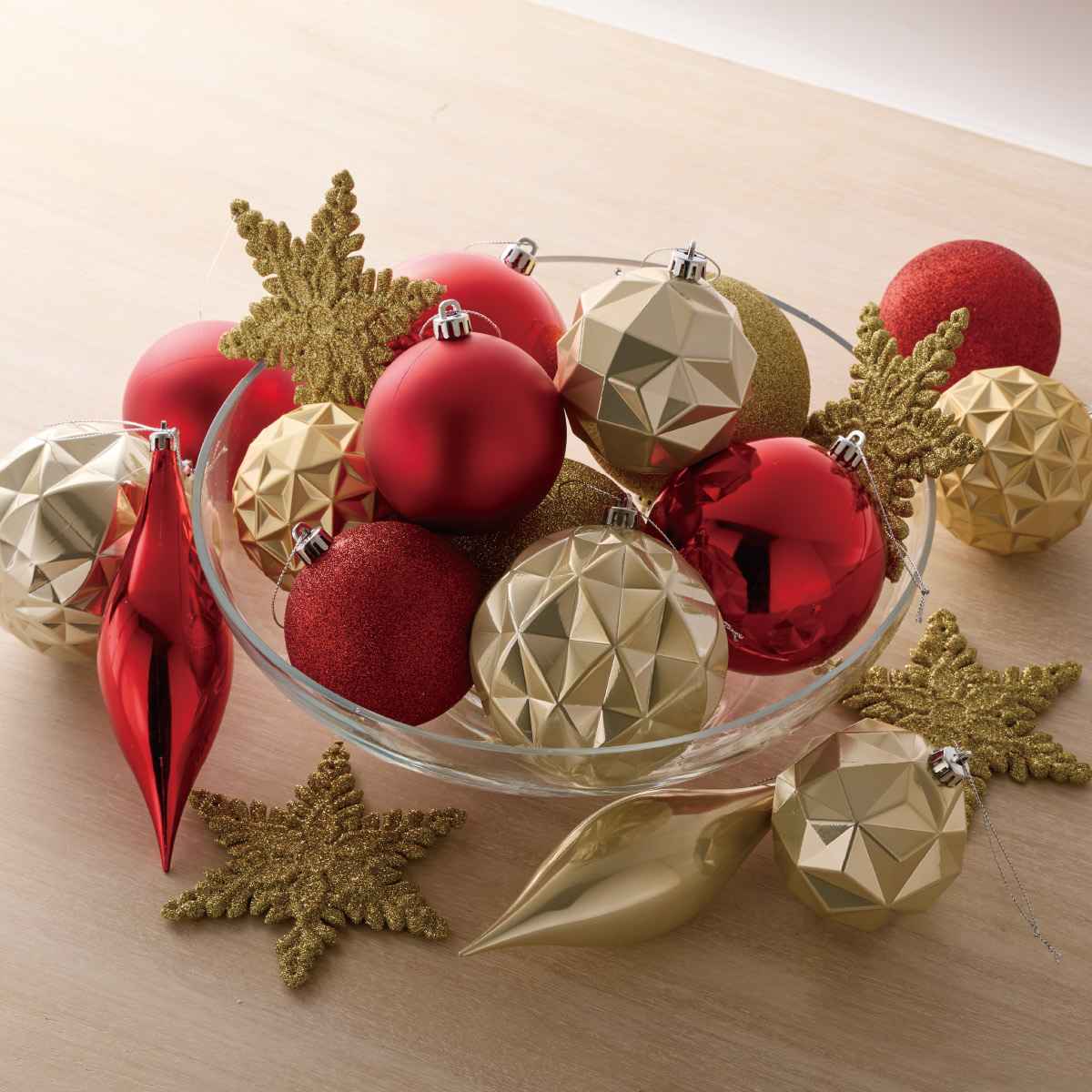 オーナメントボール、ドロップ、スノーフレークを20個セットで。大ぶりサイズが目を引くバラエティオーナメントセットです。