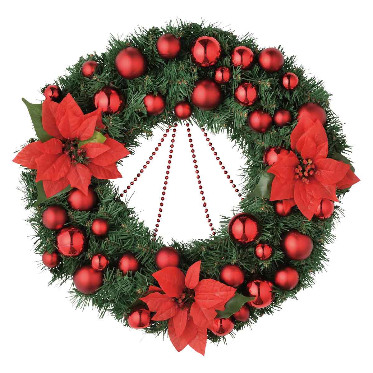 たくさんのオーナメントボールと大きなポインセチアの飾りのついた直径50cmのリース。