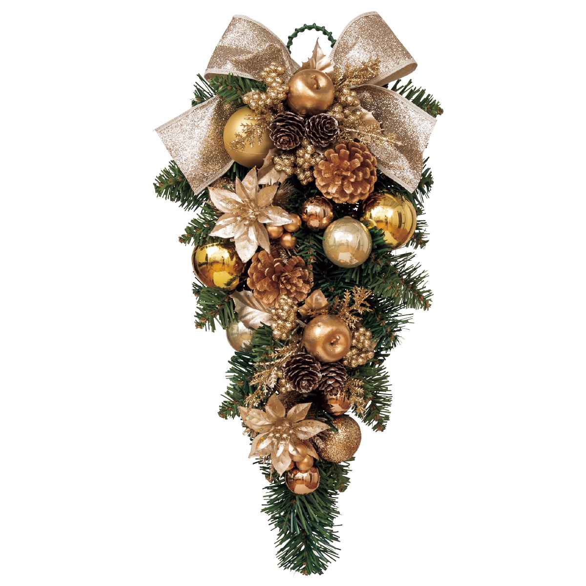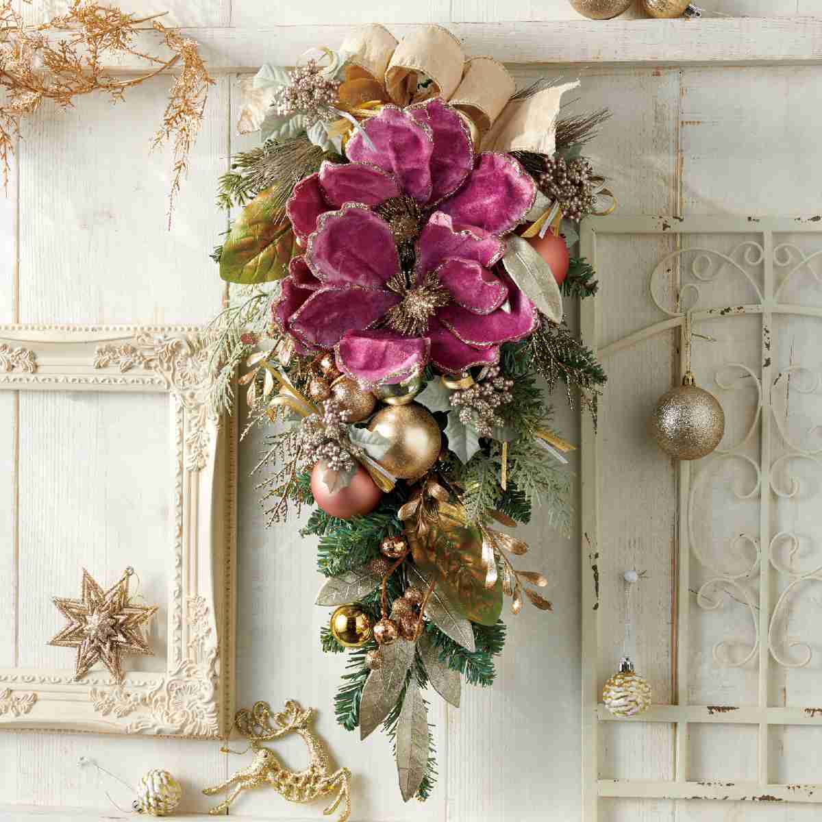 花や植物を束ねて飾る人気の壁飾り「スワッグ」。壁に吊るしてもこのまま置いても空間にクリスマスの温かい彩りをもたらします。豪華なあしらいがとても魅力的です。