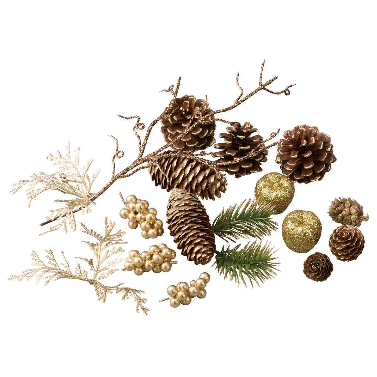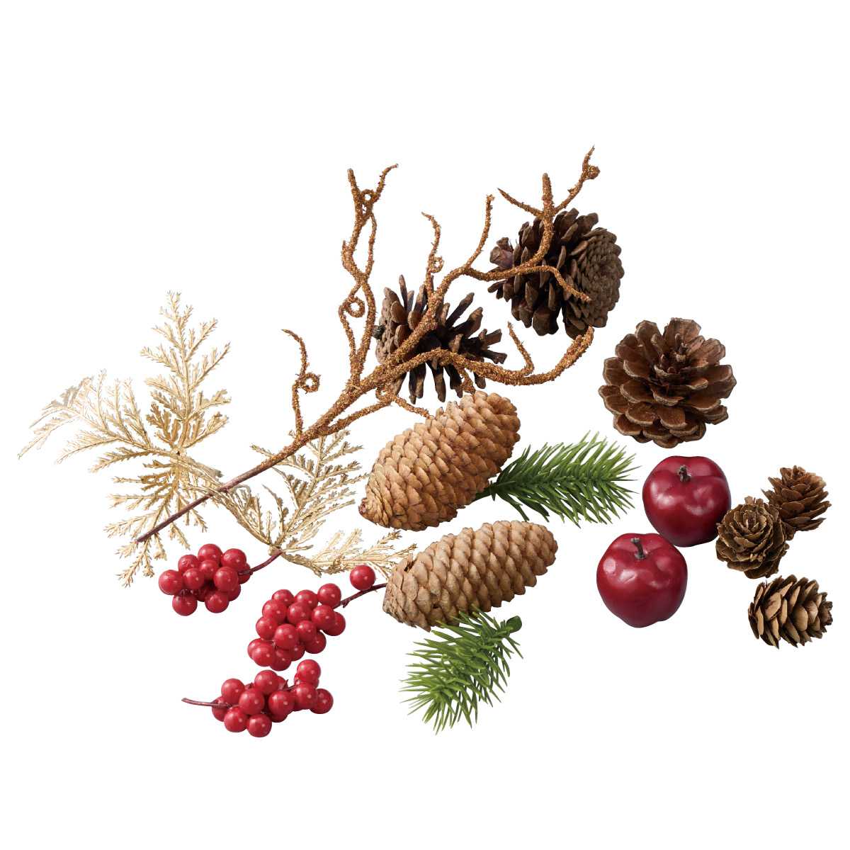 自然素材を活かした装飾の詰め合わせ。クリスマスディスプレイの小道具として幅広い演出に活躍します。パッケージに入っています。