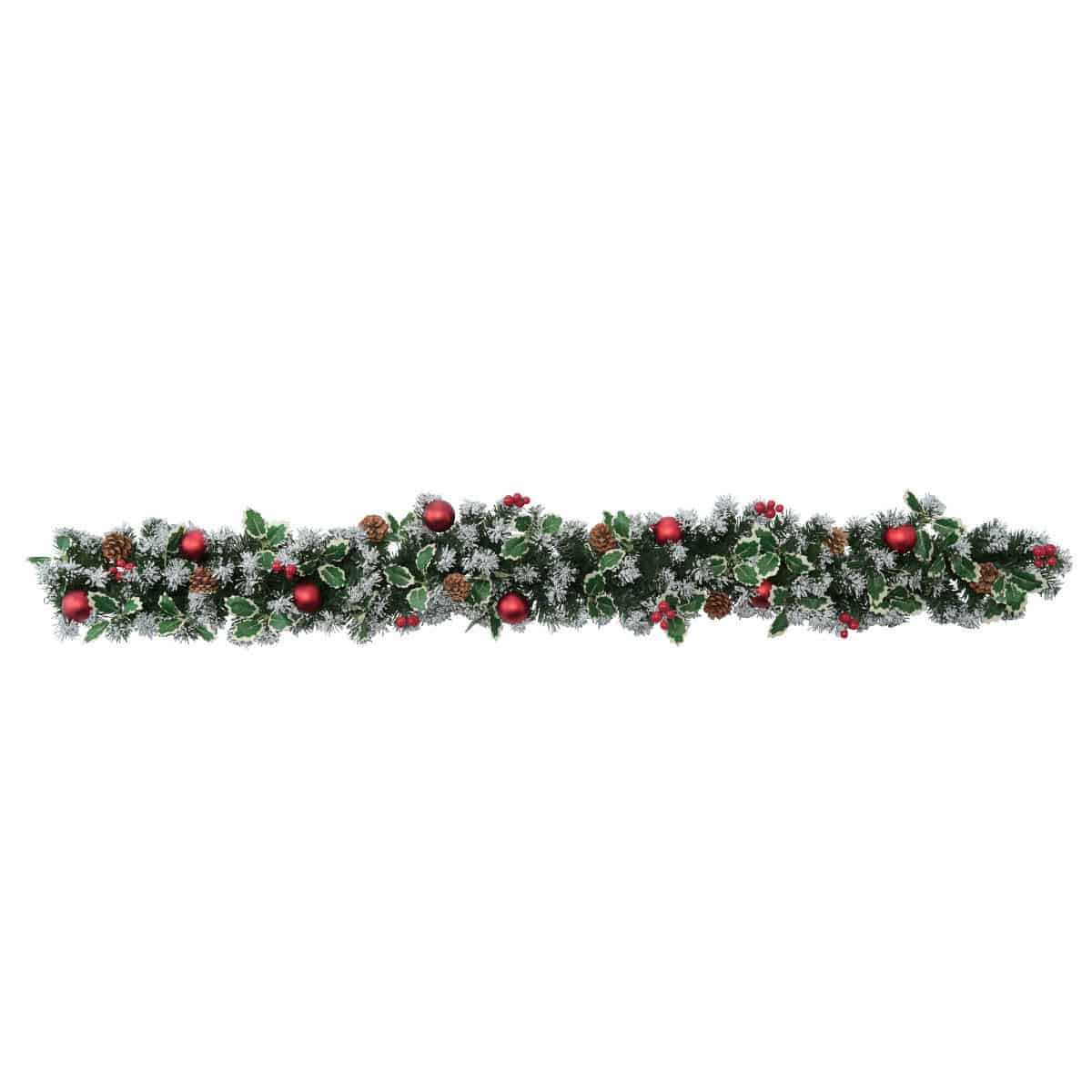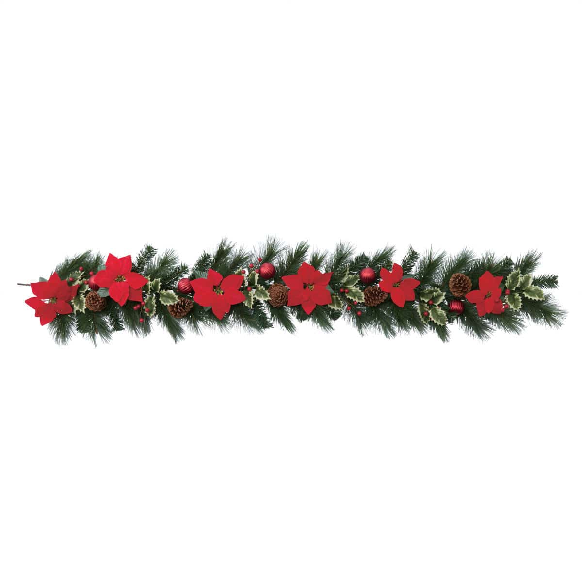180cmのゴージャスなデコレーションガーランド。ガーランドのグリーンとポインセチアやオーナメントボールのレッドのクリスマスカラーで一層クリスマスらしいディスプレイに。