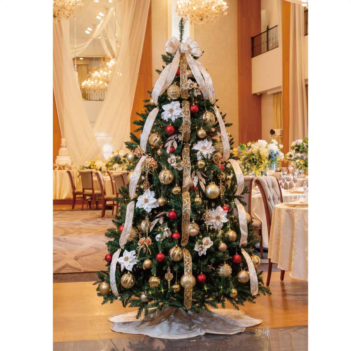 豪華なゴールドのオーナメントに白のツリースカートが映えます。