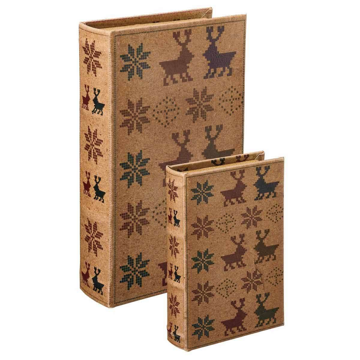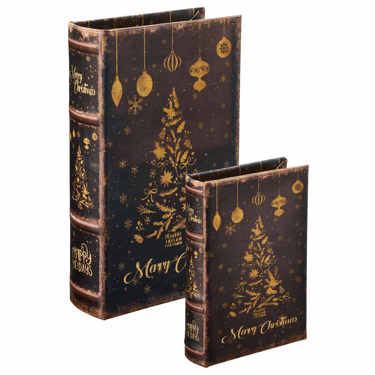 クリスマス柄の入った本の形のオブジェ。小・大の2個セットで中に小物雑貨を入れることができます。立てて飾っても寝かせてボックスとして使っても。