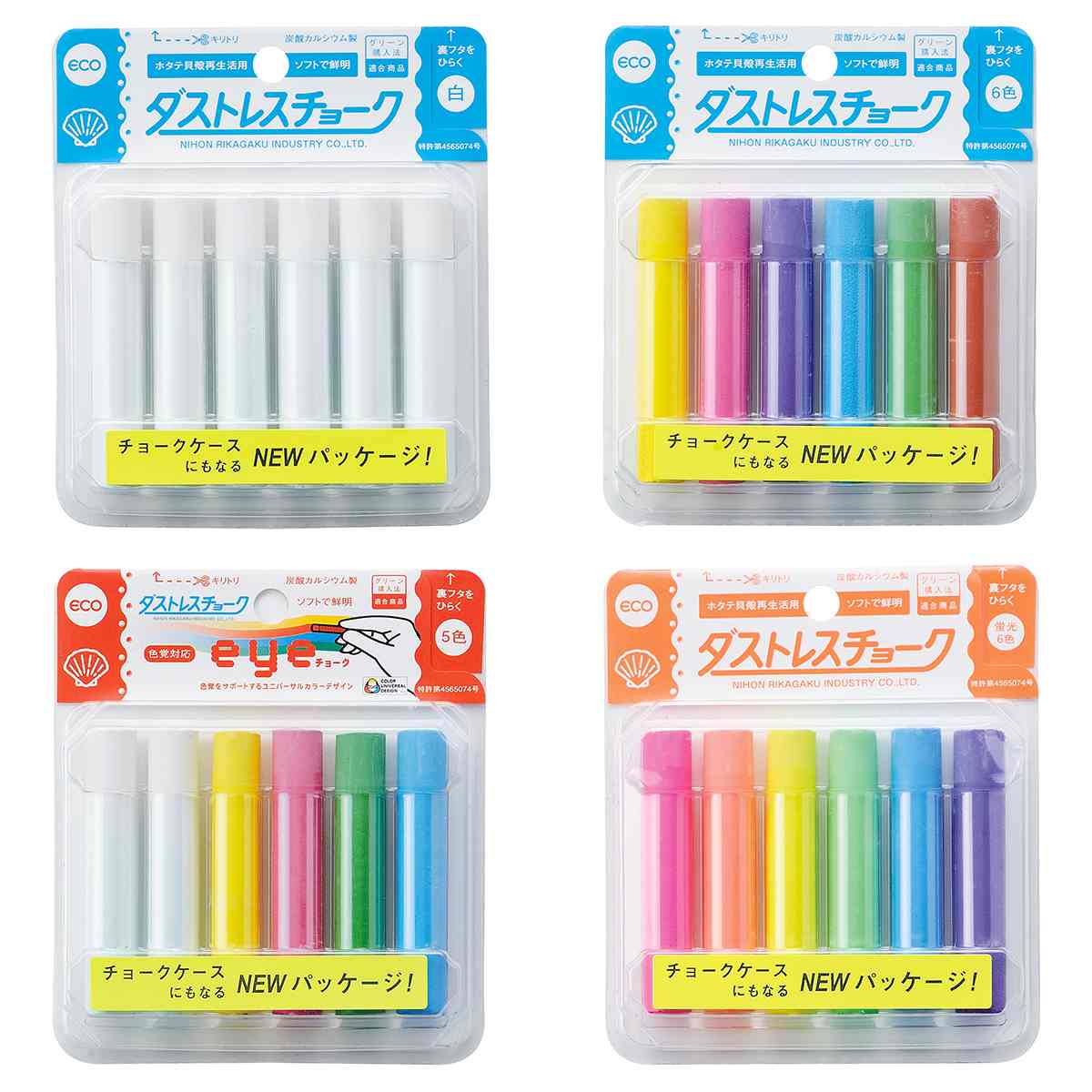 粉が飛びにくく、ホタテの貝殻配合で環境にも人体にも優しいチョークです。石膏チョークに比べて磨耗度が少なく、2倍以上長く使えて経済的です。