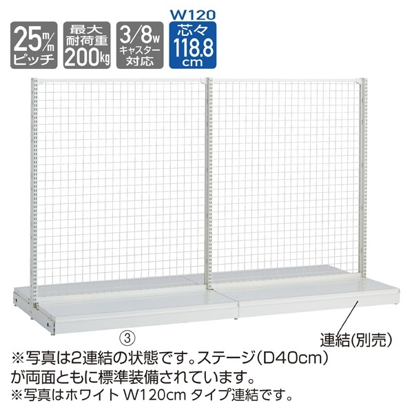 スリムな柱で売場をスマートに演出できます。ステージ(D40cm)が両面ともに標準装備されています。