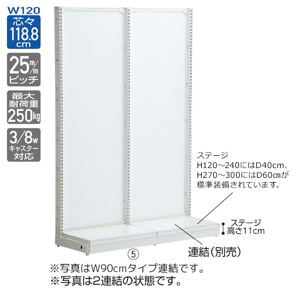売場は勿論、バックヤードや倉庫での商品の保管や整理にも最適です。 ステージH120~240にはD40cm、H270~300にはD60cmが標準装備されています。(ステージ高さ11cm)