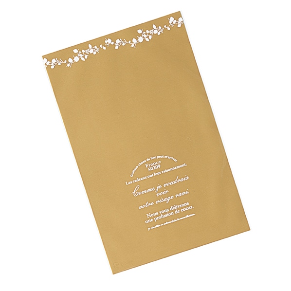 定番として使うことができる、OPP透明袋です。さりげないデザインなので、中に入れる商品をしっかり引き立ててくれます。背面のクラフトのような色合いが、ナチュラルテイストのお店や美容雑貨、焼き菓子などのセットアップギフトにぴったり!