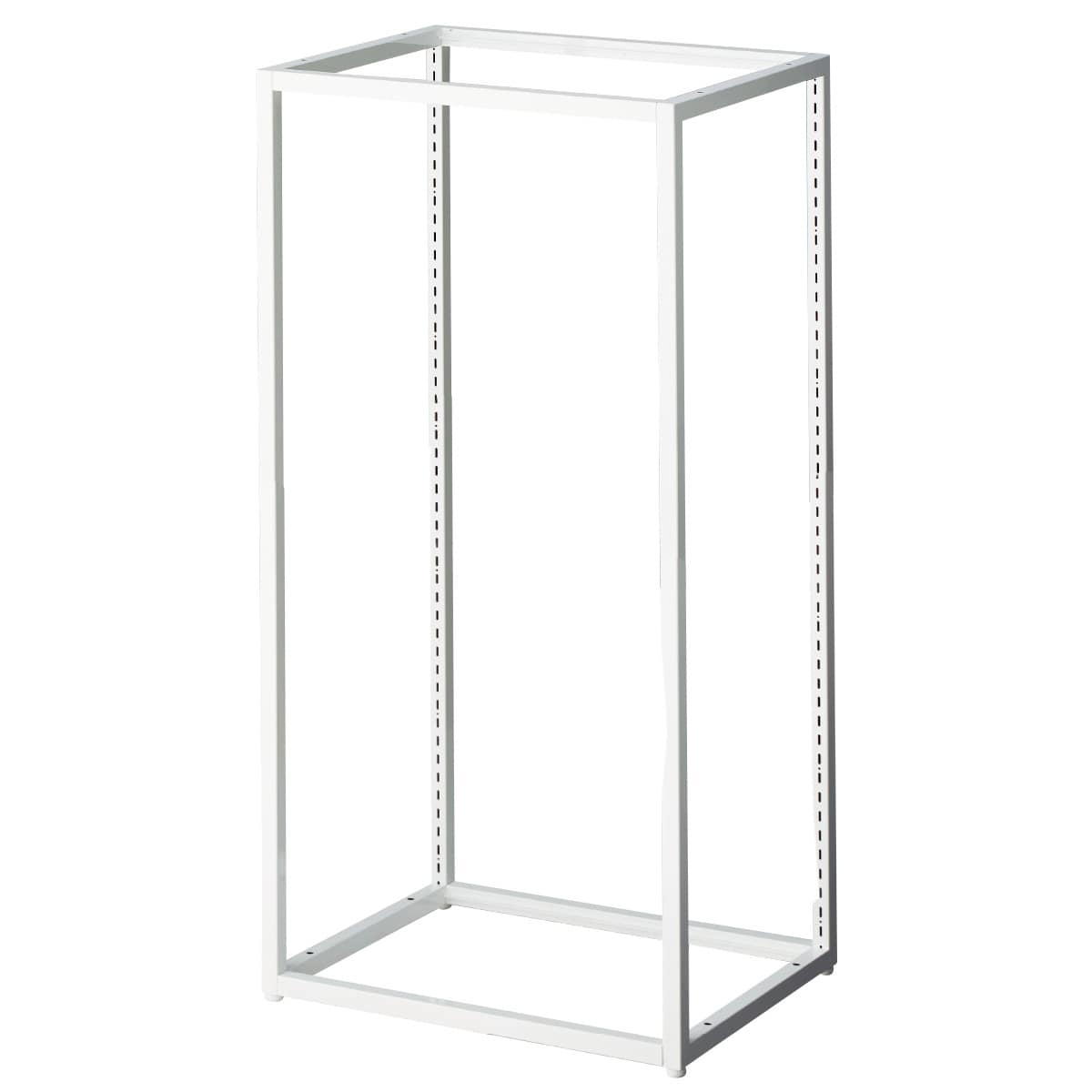 横に繋ぐ、縦に積む、組み合わせ自在のブロックフレーム。 店頭でのディスプレイや什器エンドに、H60cmは卓上用にもオススメです。 アジャスターを取り外して付属のジョイントボルトを使えば、H90・120cmの上に2連結まで取り付けできます。付属のジョイント金具をスリット穴に引っ掛けることで左右を5連結までできます。 ブロックフレーム本体には前後はありません。