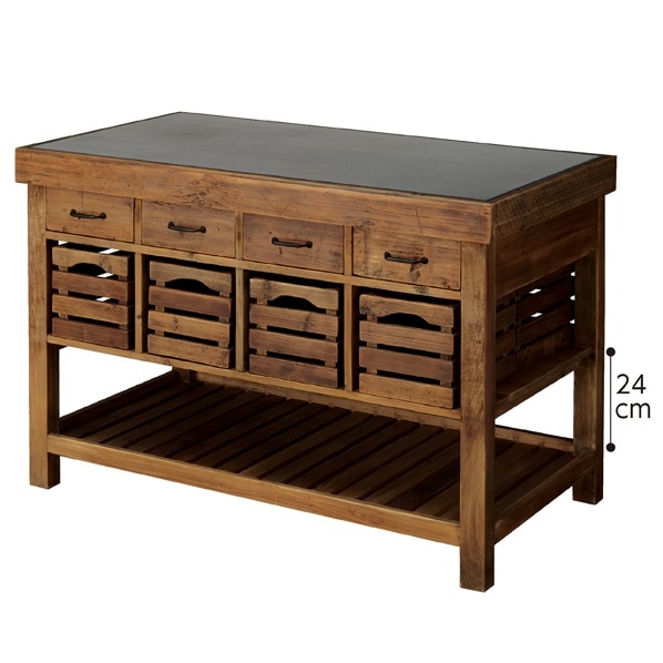 天板にトタン、本体に無垢古材を使用し、両面に引き出しと収納ボックスを計16個備えた高級感ある中央什器です。