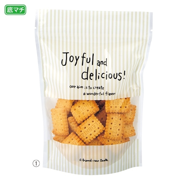 ジップ付きの乾燥材対応スタンドバッグです。お菓子をきれいに魅せる商品です。