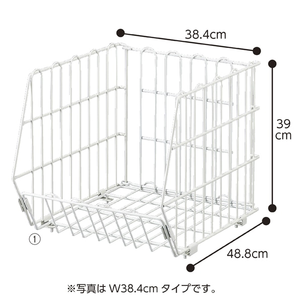 - (1)(2)奥行48.8×高さ39cmカゴ:高さ(前11.4・後35.4)cm 線材:カゴ直径4mm 枠部分直径6mm