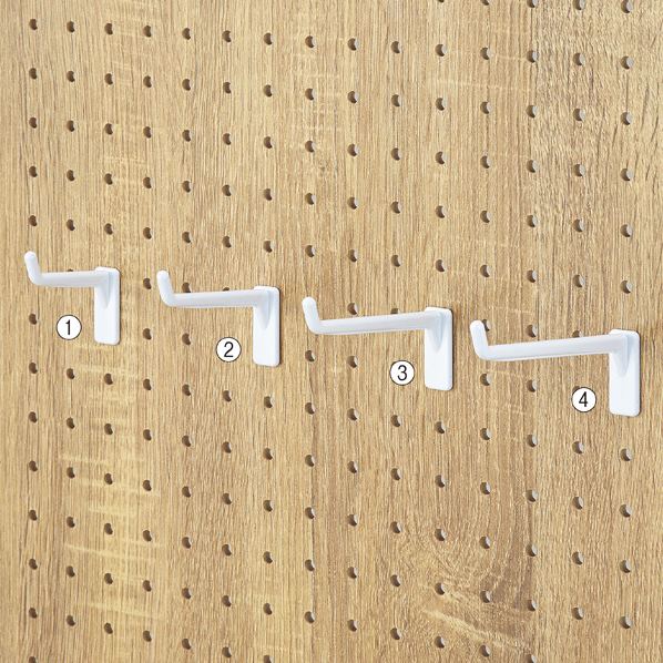 有孔ボード用のフックです。樹脂製のため、低コストで軽く錆びることがありません。また、廃棄処分する際もカンタンです。