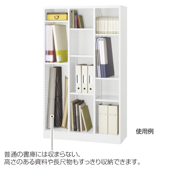 丈夫なスチール製。3cm間隔で棚板を設置できるため、サイズ違いの本やファイルを効率よく収納できます。 列ごとに、3cm間隔で棚板を動かすことができます。オプションで棚板の追加も可能。 普通の書庫には収まらない、高さのある資料や長尺物もすっきり収納できます。