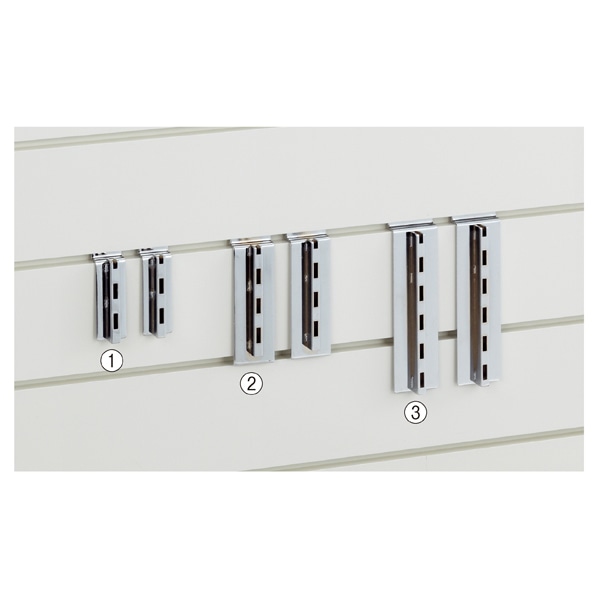 サポート(棚柱)はスリット(ブラケット取り付け穴)が25mm間隔で開いています。ブラケット(棚・バー受け)は25mmのスリットピッチに合わせて棚、バーなどそれぞれ専用のものを使用しています。