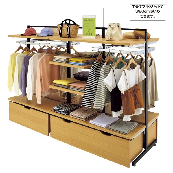 また商品に合わせて、棚板やバーの奥行きをお選びいただけ、よりバリエーションに富んだ展開が可能です。