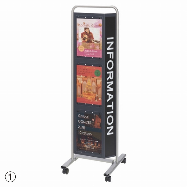 表示面がL型になっており、正面からも側面からもアピールできます。側面の表示パネルは左右逆付けも可能です。(1)(2)A4サイズのポスターをタテ3段表示 (3)(4)A2サイズとA3サイズのポスターを2段表示できます。