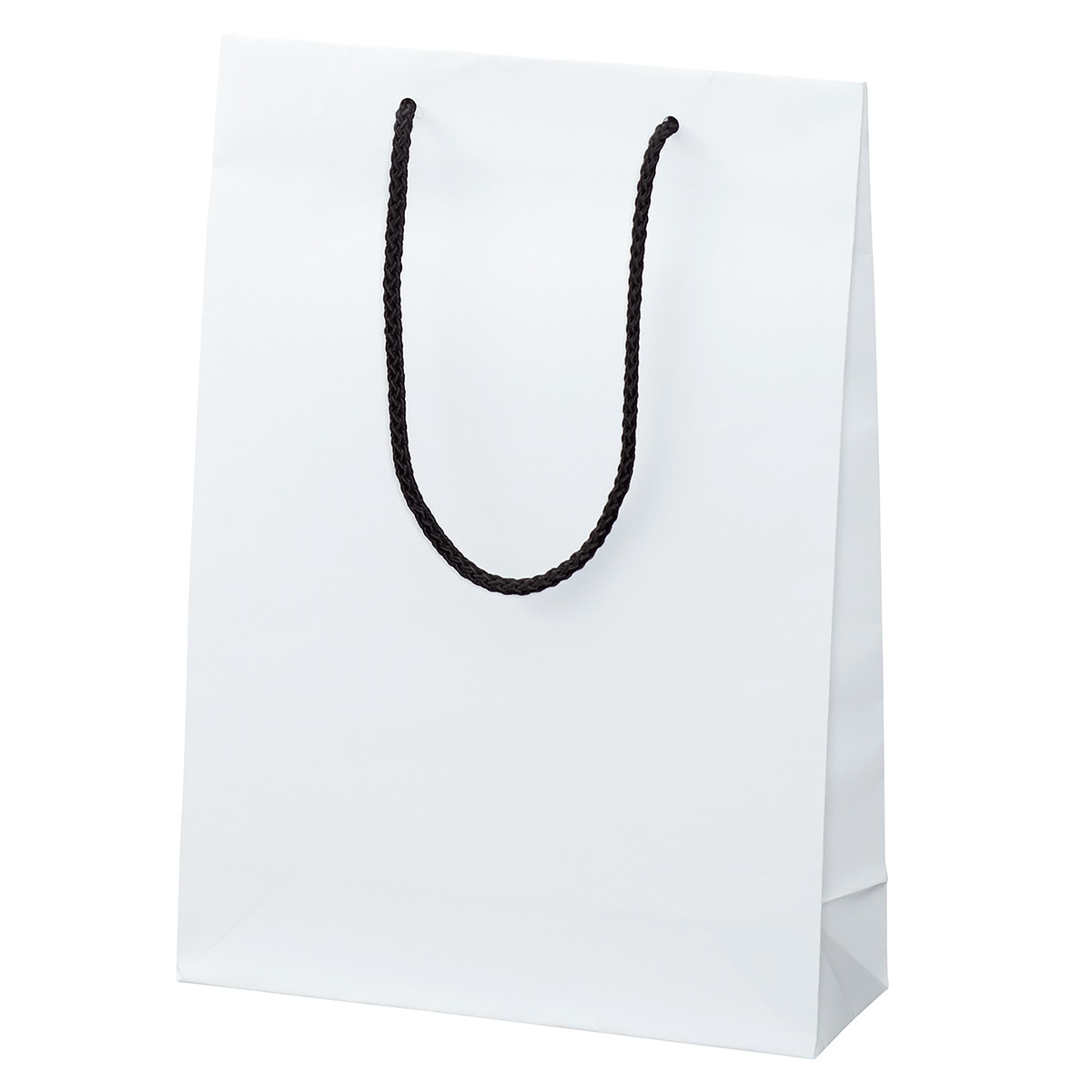 高品質ながら安い価格で業務用に最適なクラフト手提げ紙袋をご用意しました。ベーシックな白と黒の落ち着きのあるマット貼り紙袋です。
