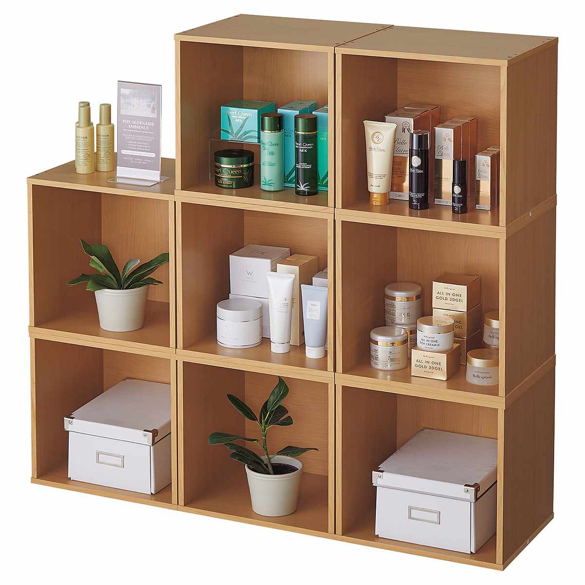 シンプルなボックスタイプの収納棚。天板にダボの取り付けができ、自由に連結できます。
