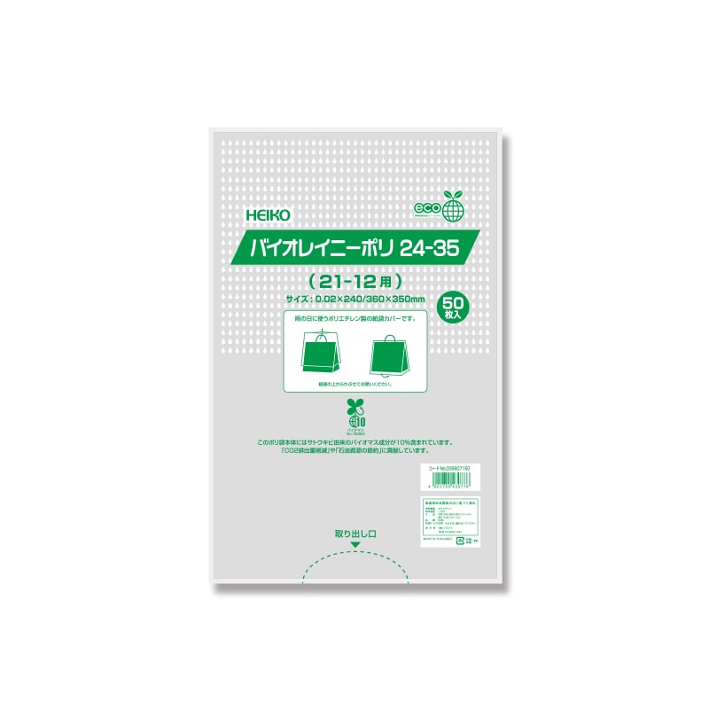 雨の日に紙袋が濡れないようにするための雨よけカバーです。生物由来の有機資源を原料としたバイオマス成分を10%含んだポリ袋です。主原料のサトウキビは、育成時に光合成をして大気中のCO2を吸収するため、石油化学由来の原料と比較すると大幅なCO2の削減に貢献します。