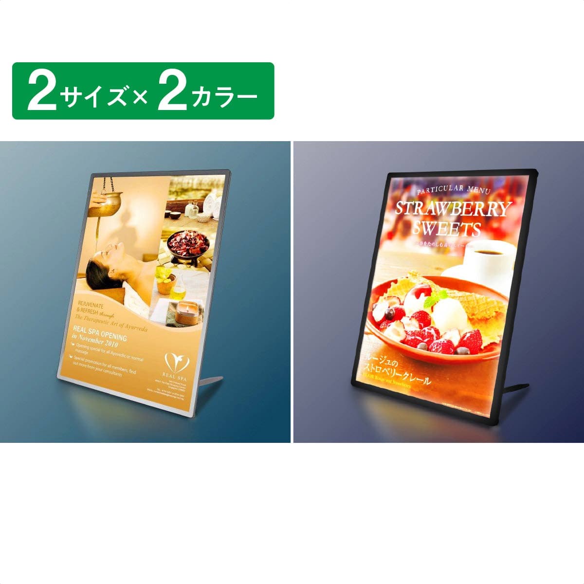 超薄型・軽量・高照度のLEDバックライトパネル。卓上・壁掛けに対応しています。ポスターはサイドから差し込むだけで簡単入替。卓上ではタテ/ヨコ使用可能で角度も調節できます。
