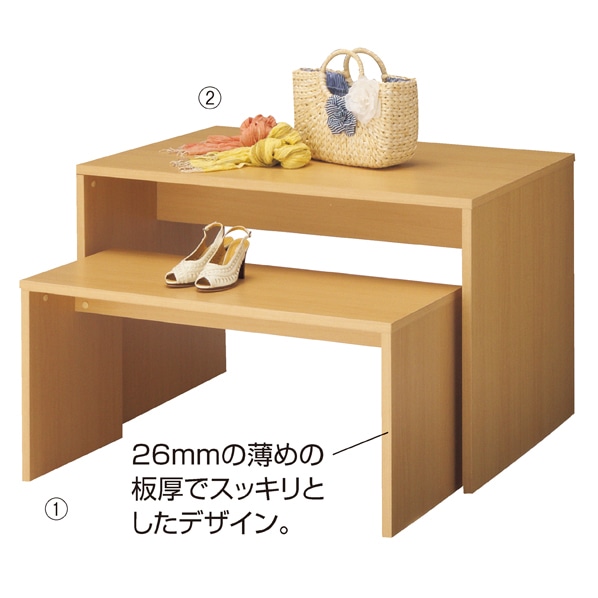 すっきりディスプレイできるシンプルな木製テーブル。 26mmの薄めの板厚でスッキリとしたデザイン。