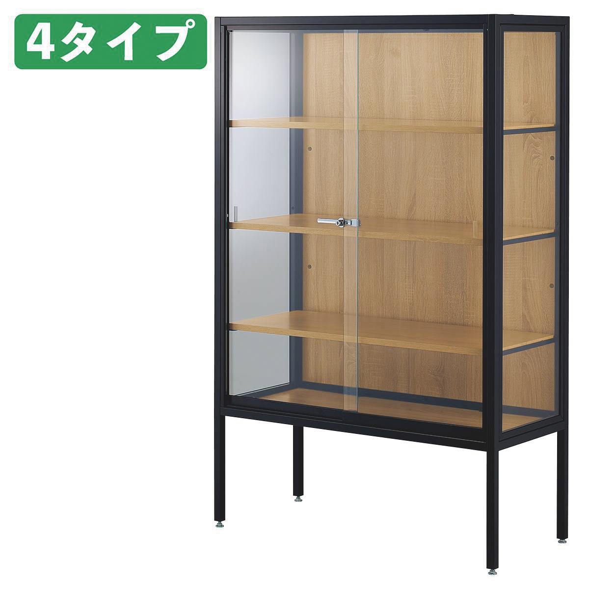 カタログ掲載品名 :ラテラルショーケースブラック W90×H150cm パネル:ラスティック柄 木目調スチール棚