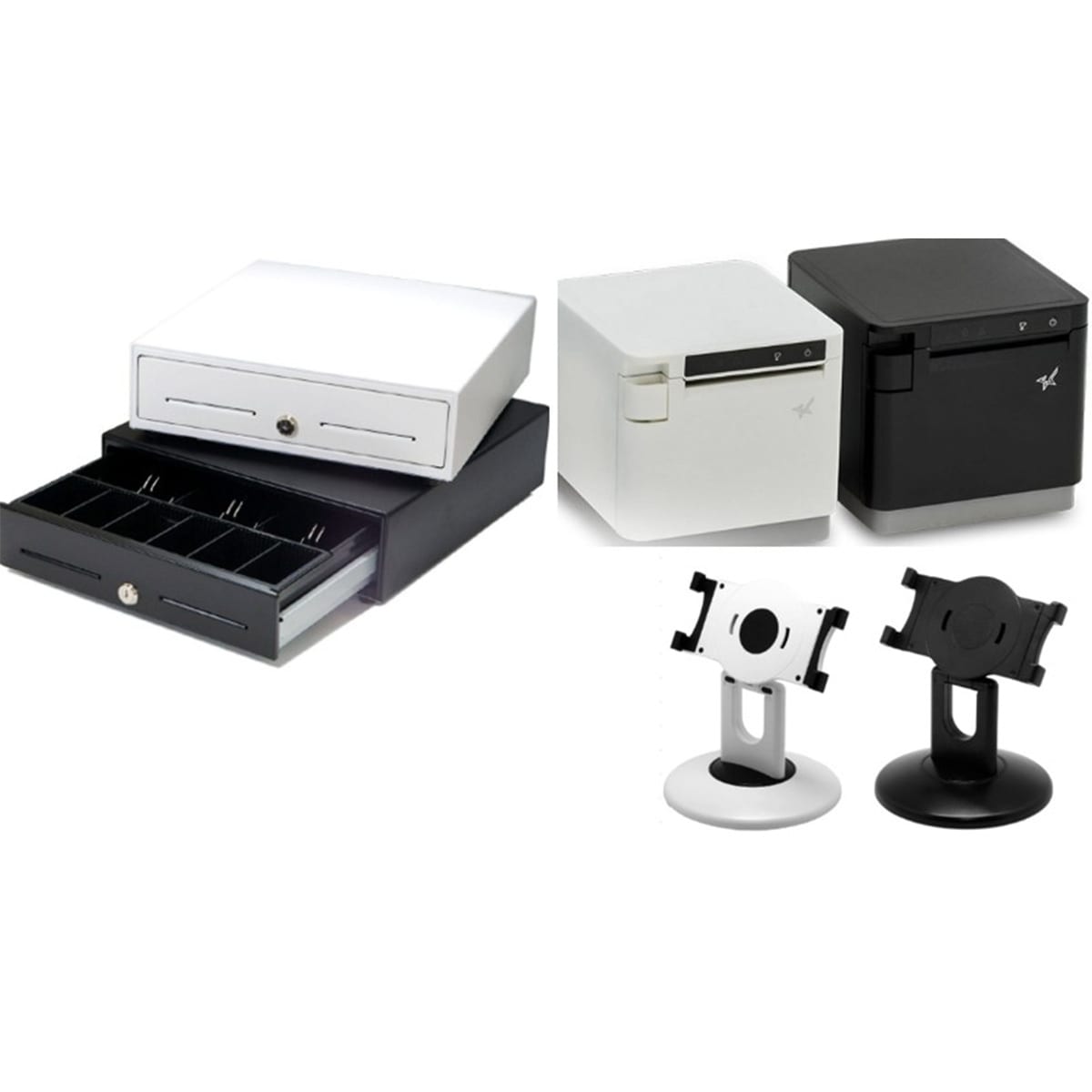 iPad利用のPOSレジを導入する方におすすめの、周辺機器のPOSレジセットです。人気のPOSアプリ「スマレジ」「エアレジ AirREGI」「Square スクエアPOS」「Stores ストアーズレジ」でお使いいただけます。スター精密のレシートプリンター「mC-Print3」と33cm幅のキャッシュドロア「E-33H」、iPadで使える汎用タブレットスタンドのセットになります。