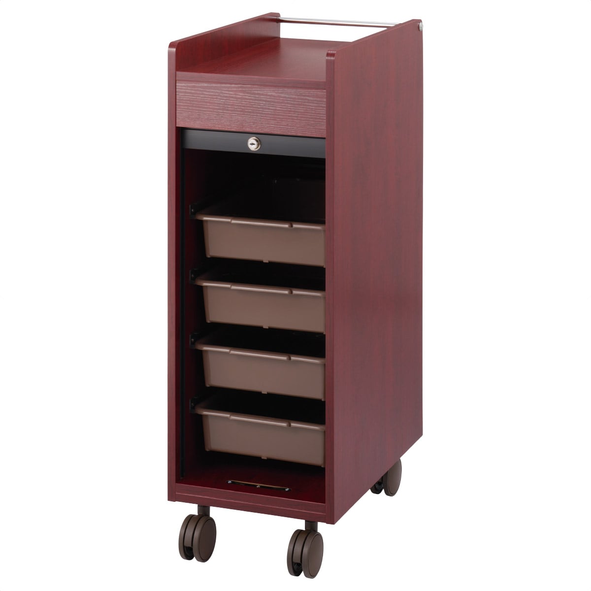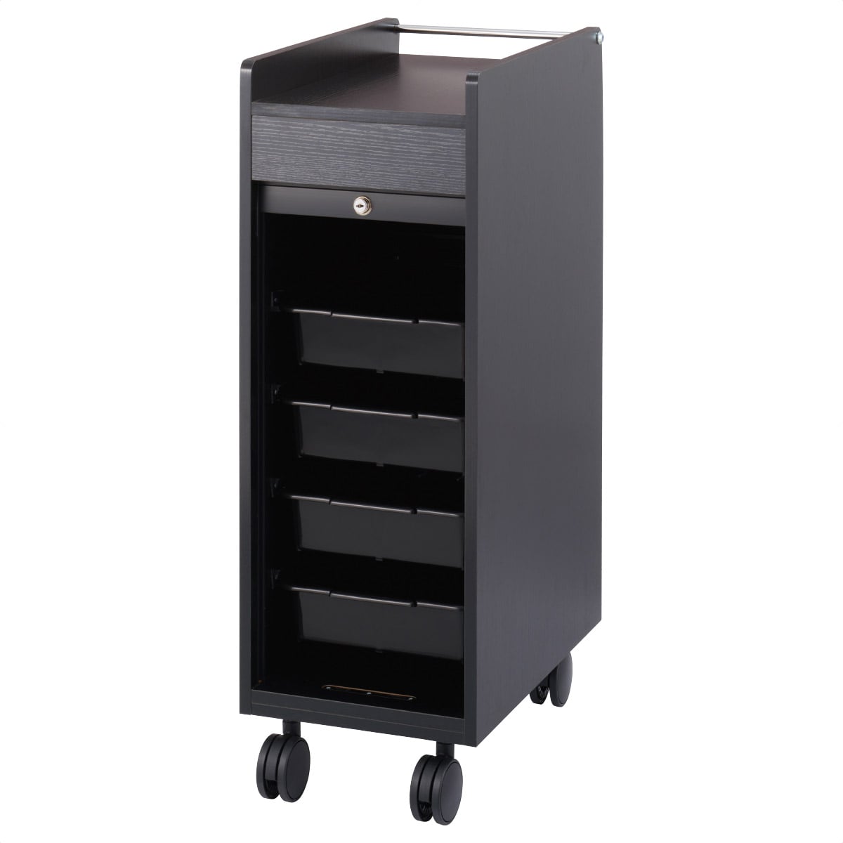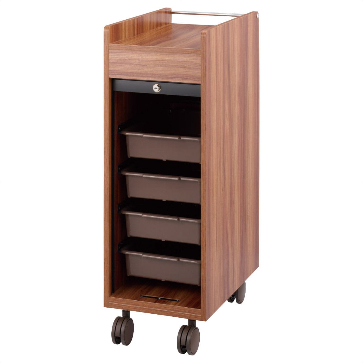 自分だけの鍵付きパーソナルワゴンにおすすめです。フリーランスの美容師の方にも!シャッター付きで、鍵を掛けることでプライバシーを守ることができます。引き出し式パット4段付きです。カラーは3種類の木目柄からお選びいただけます。キャスターは動きがスムーズな直径75mの双輪キャスター使用。