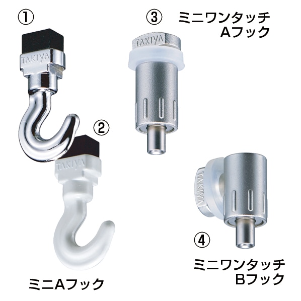 レールを天井付けにするか、壁付けにするか、また対応ワイヤー径や耐荷重によって、フックをお選びください。