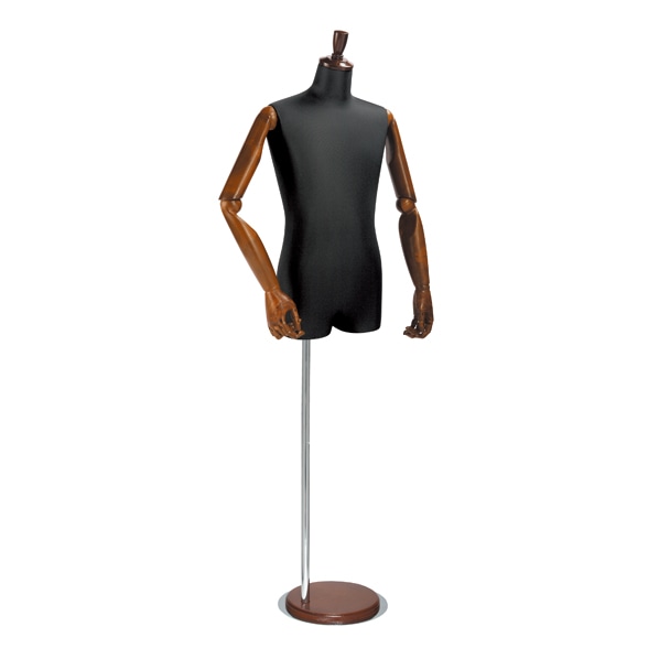腕があるトルソーなので、よりリアルなコーディネートを見せることができます。アウターやセットアップなどのトータルコーディネートやバッグなどの展示におすすめです。腕の部分に動きがあるディスプレイが可能なので、より生き生きとした展示ができます。