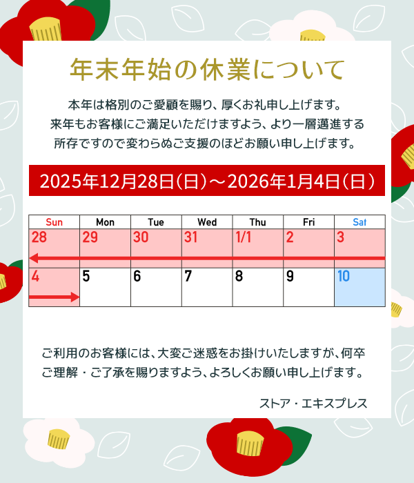 ◆12月27日(土)は、弊社カスタマーサービスは17:00まで営業いたします。