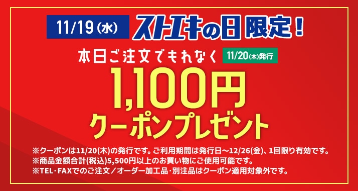 【11/19(水)ストエキの日特典】本日のご注文で次回使える1,100円OFFクーポンプレゼント! キャンペーンについて ※クーポンは11/20(木)の発行です。ご利用期間は11/20(木)~12/26(金)、1回限り有効です。 ※商品金額合計(税込)5,500円以上のお買い物にご使用可能です。 ※TEL・FAXでのご注文/オーダー加工品・別注品は除きます。 ※当社WEB発注システム「店研創意ビジネスネット」はキャンペーン対象外です。